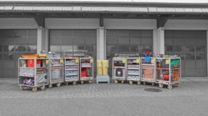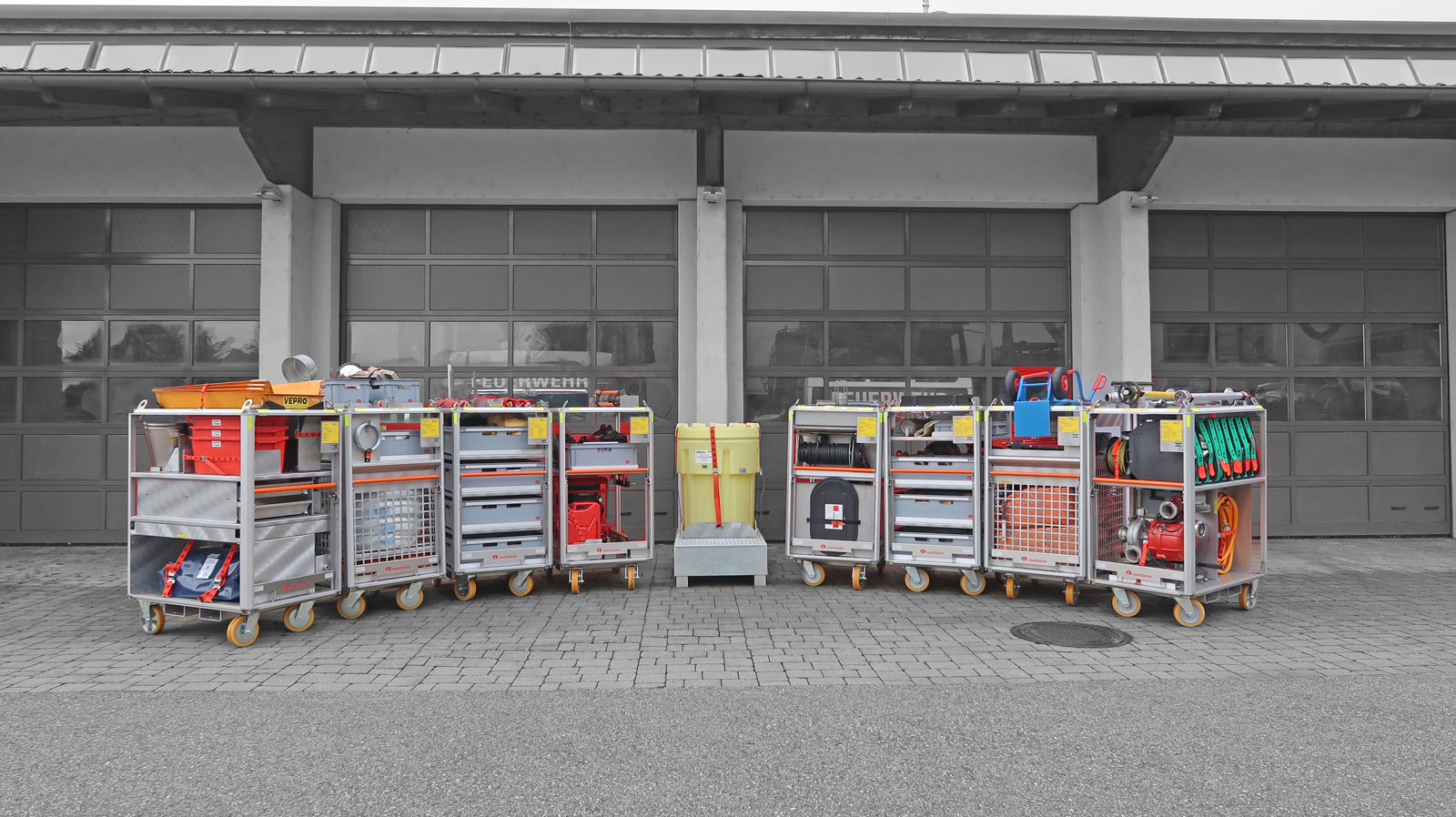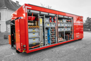 Öl-Stützpunktequipment: Auffangen, Umpumpen und Binden von Ölen und Treibstoffen. Maßnahmen zum Schutz der Grund- und Oberflächengewässer. Abdichten von undichten Stellen. Mitnahme von Ölbindemittel in größeren Mengen.